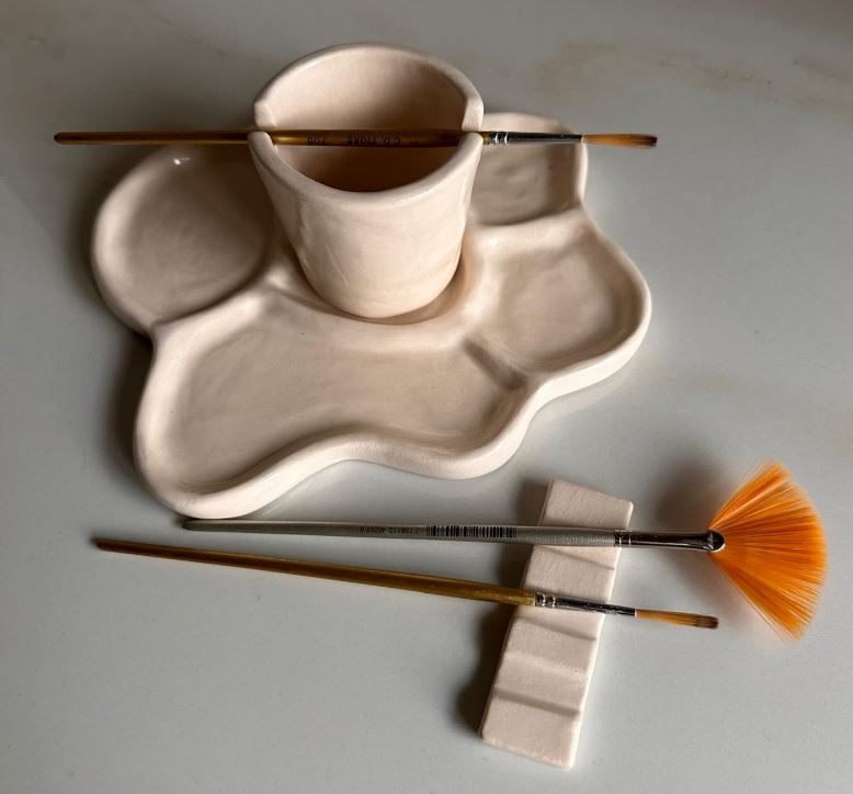 Este set lo preparamos para una amante de la pintura, nos presentó una imagen con la idea de lo que necesitaba para su emprendimiento y constaba de una paleta de forma orgánica sumado a un vasito con ranuras para colocar el pincel en uso y una plaquita con ranuritas variadas para intercambiar pinceles a medida que se van utilizando ♥